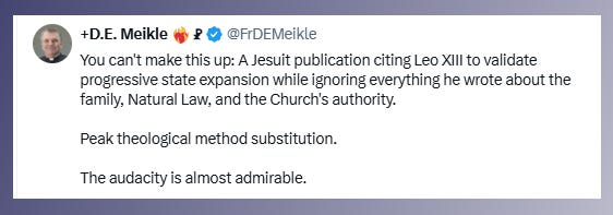 The same pattern repeats here: take Catholic authority (Leo XIII), strip away its metaphysical and theological content, and use the empty shell to sanctify contemporary “progressive” politics.26